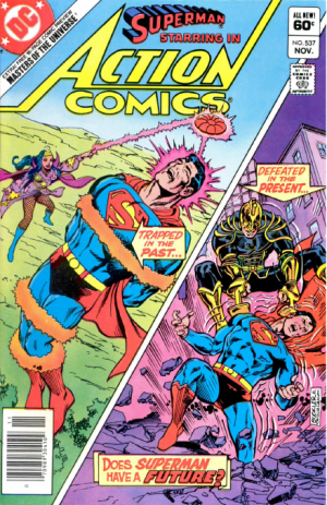 As Superboy, he regularly flies so fast that he jumps through time (just like Flash did in Flashpoint). He then joins The League of Superheroes in the future, a group of superheroes with a huge amount of member.