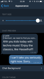 The most ultimate WhatsApp killer is the option to customize the appearance of your Telegram X. Leaving the fancy factor aside, having larger text helps Telegram X user to read their messages better. You also have 30 background wallpaper to choose and four different themes.